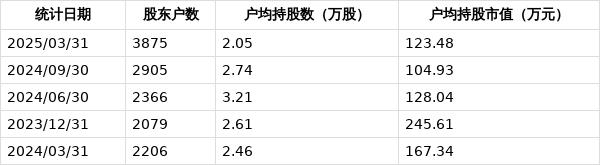 从4月25日公开信息显示,浙海德曼截至2025年3月31日公司股东户数为3875户,较上期(2024年9月30日)增加1155户,增幅为42.46%,持股趋于分散。