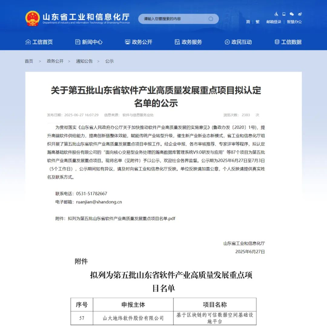 近日,山东省工信厅公示了第五批山东省软件产业高质量发展重点项目拟认定名单,山大地纬自主研发的“基于区块链的可信数据空间基础设施平台”成功入选,进一步彰显了公司在区块链与数据要素领域的技术实力。