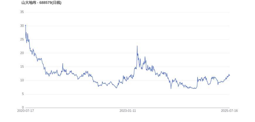 2020年7月17日,山大地纬的市值巅峰达到151.64亿元,股价也顺应升至37.91元。而至7月16日收盘,山大地纬的股价为11.88元,市值为47.52亿元,相比峰值时期市值减少104.12亿元,市值蒸发了68.66%。