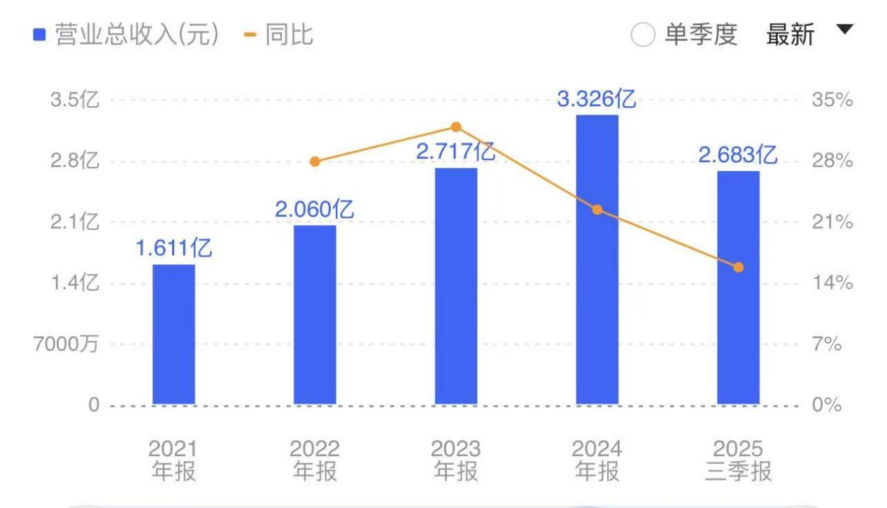 思看科技发展迅速,体现在业绩上,2021年至2025年前三季度,公司营收呈阶梯式增长,分别为1.61亿元、2.06亿元、2.72亿元、3.33亿元、2.68亿元;净利润分别为0.68亿元、0.78亿元、1.14亿元、1.21亿元、0.79亿元。