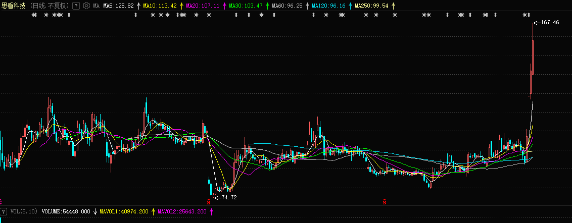行情显示,1月29日至2月3日,思看科技股价累计上涨67.48%,其中,1月30日实现20CM涨停,2月3日报156.06元/股,创历史新高。
