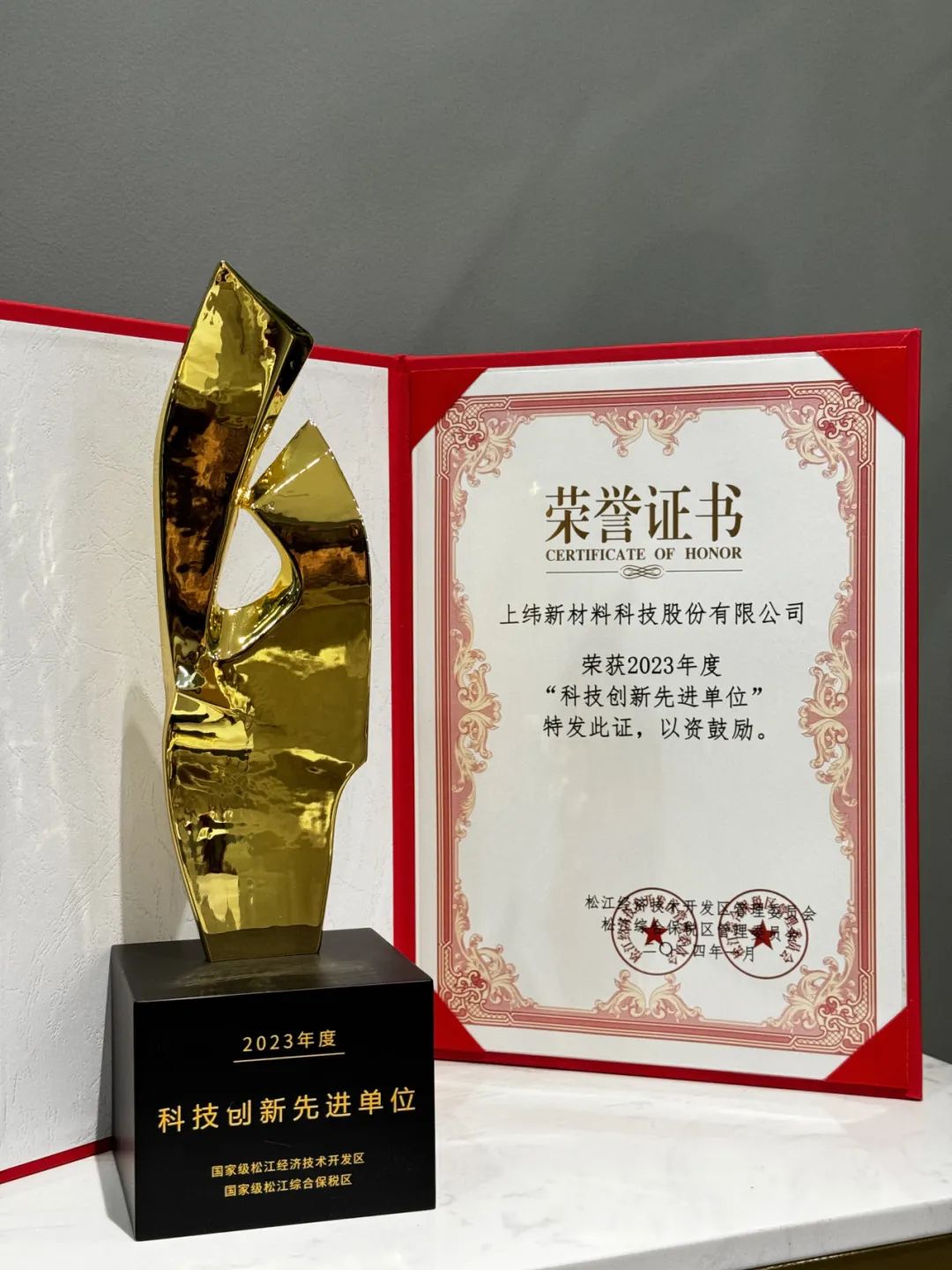 王靖等区领导为部分受表彰的优秀企业及企业家们颁奖,向为长三角G60科创走廊建设作出贡献的全区企业家和杰出人才表示感谢。近年来,松江经开区强化创新驱动,厚植培育科技创新沃土,激发企业创新创造活力,推动制造业高端化、智能化、绿色化,全力做强创新引擎,大力打造科创高地。上纬新材此次被授予“科技创新先进单位”、“2023年度安全生产先进单位”两项奖项,是对上纬新材的充分肯定,以及对上纬产品背后所秉持的自主创新理念的高度认可。