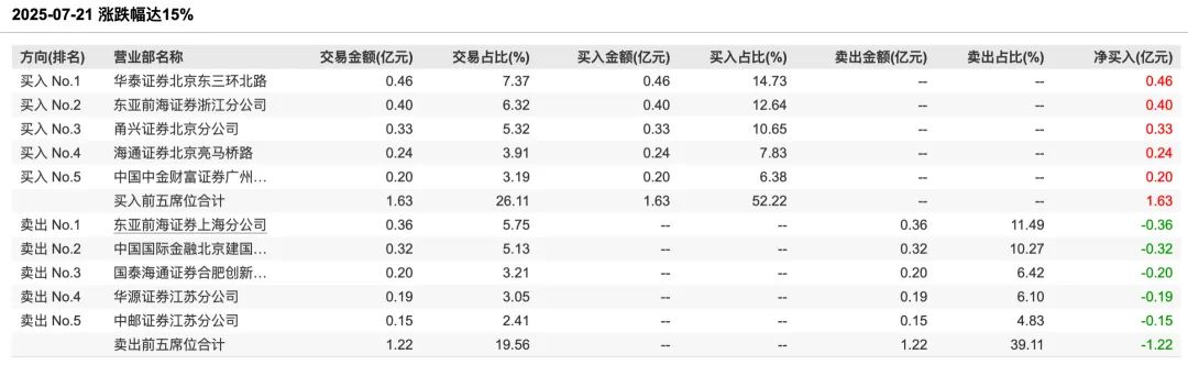 7月9日至21日期间,上纬新材连续9个交易日登上龙虎榜。7月21日的榜单显示,当日买入前五席位合计交易额为1.63亿元,卖出前五席位合计为1.26亿元。其中,华泰证券北京东三环北路以4600万元的净买入额位列买一席位,东亚前海证券上海分公司以3600万元的净卖出额占据卖出席位首位。
