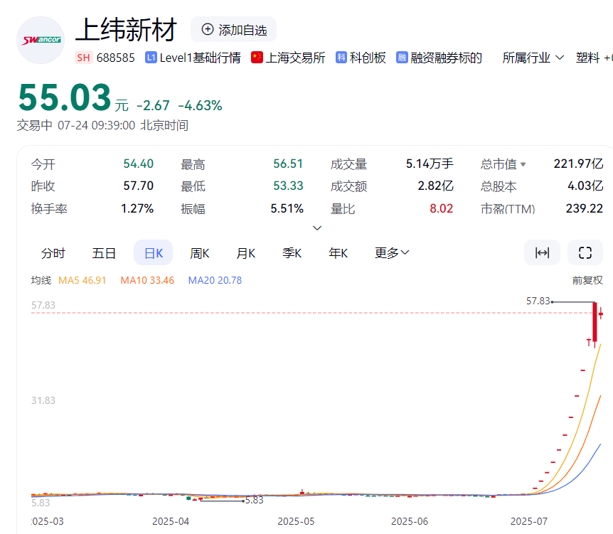 7月9日开始,上纬新材股价涨停,创下A股市场“20cm”涨停板连续封板的纪录。短短10个交易日。公司市值从30多亿元飙升至194.38亿元。资本市场的狂热表现为本次收购案增添了几分魔幻色彩。截至发稿前,股价为55.03元/股,市值达到221.97亿。