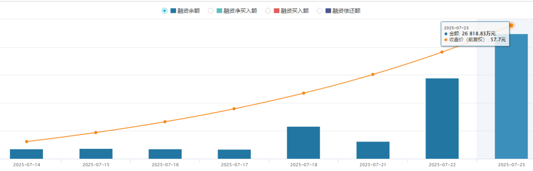 与此同时,上纬新材的融资余额近日突然暴增,连续刷新历史峰值。7月22日,公司融资净买入1.36亿元,融资余额为1.73亿元,创历史新高,且较前一日增幅达365.43%,在两市中排名第九;7月23日,融资余额进一步增至2.68亿元,较前一日增超50%,金额再度改写纪录。