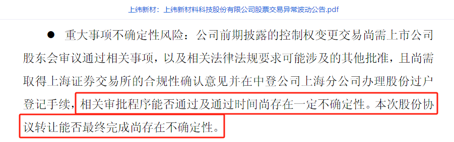 上纬新材公告称,本次股份协议转让事项的相关审批程序能否通过、通过时间均存在不确定性。