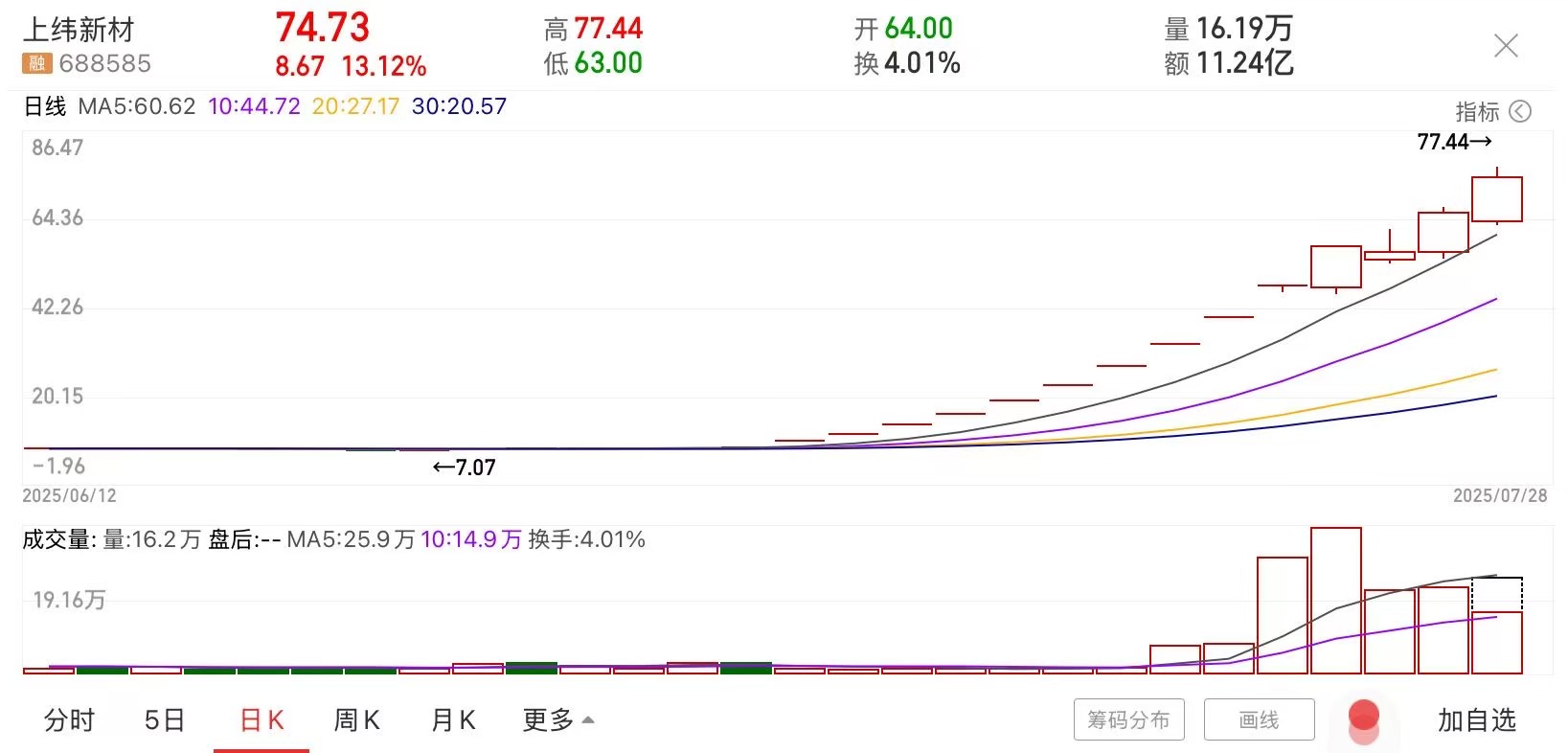 具体来看,7月28日早盘,上纬新材股价再度大涨,截至午间收盘,其股价报74.73元/股,涨幅超13%。拉长时间来看,该股年内累计涨幅已达10倍以上,为A股2025年以来首只10倍股。