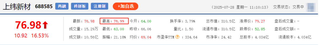 7月28日早盘,上纬新材(688585.SH)股价一度冲上76.9元,较年初6.51元的低点涨幅达1070%,成为2025年A股首只“10倍股”。