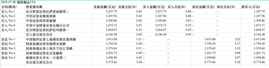 其中,第一大卖出席位中国银河证券上海浦东新区源深路营业部,在当天净卖出3415.84万元,占卖出金额的比例为2.22%。三度登上上纬新材龙虎榜的国泰海通证券上海长宁区江苏路营业部,继7月25日卖出1445.75万元后,今日再度卖出1570.6万元,位居第三大卖出席位,它曾在7月23日至 25 日大举买入上纬新材4283.92万元。