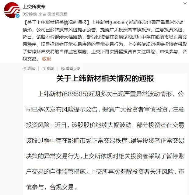 随后上交所也紧急出手发布情况通报,上交所提到上纬新材近期多次出现严重异常波动情形,公司已多次发布风险提示公告,提请广大投资者审慎投资,注意投资风险。近日,该股股价继续大幅波动,部分投资者在交易该股过程中存在影响市场正常交易秩序、误导投资者正常交易决策的异常交易行为,上交所依规对相关投资者采取了暂停账户交易的自律监管措施。上交所再次提醒投资者关注风险,审慎参与,合规交易。