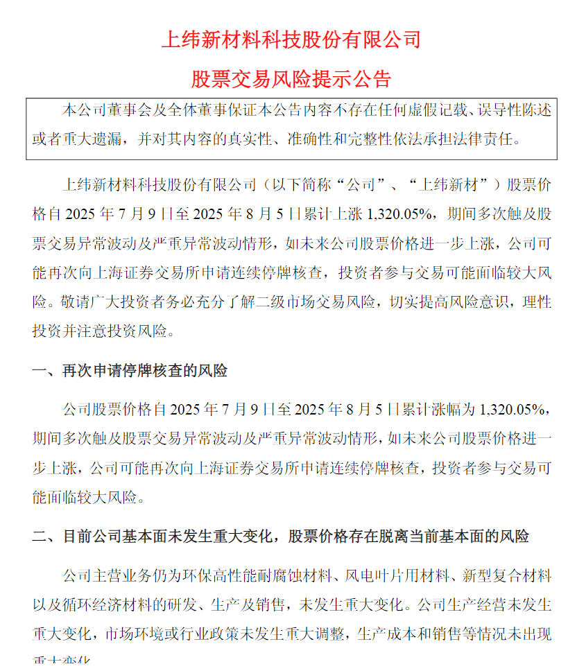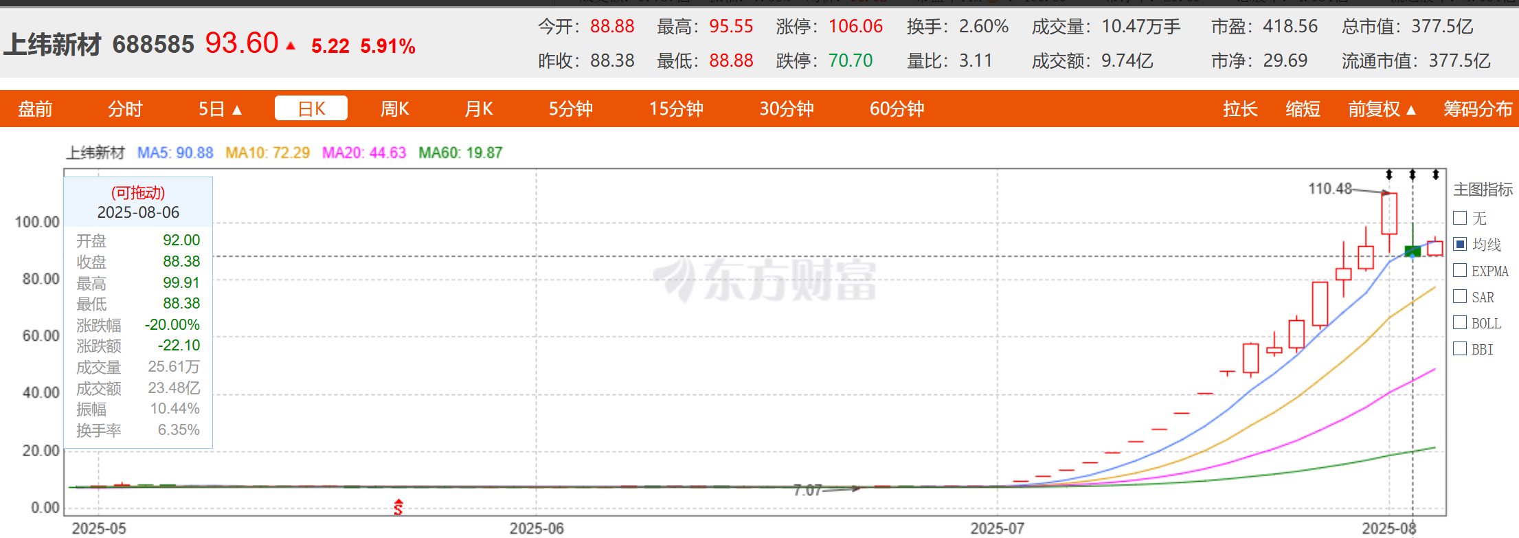 8月5日晚间,上交所发布通报称,上纬新材近期多次出现严重异常波动情形,该公司已多次发布风险提示公告,提请广大投资者审慎投资,注意投资风险。8月6日收盘,上纬新材股价报收88.38元,下跌20%。