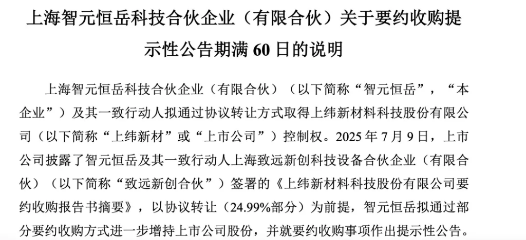 回溯来看,7月8日晚,上纬新材发布公告称,智元机器人拟通过公司及核心团队共同出资设立的持股平台,以协议转让和要约收购的方式取得公司控制权。待本次股权交易完成后,上纬新材控股股东将变更为智元恒岳,实际控制人将变更为邓泰华。