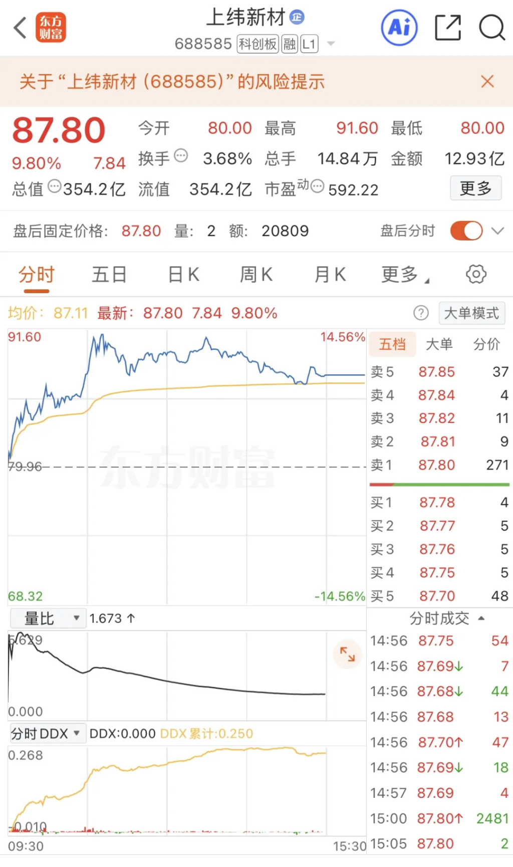 9月12日,上纬新材收报87.8元/股,上涨9.8%。