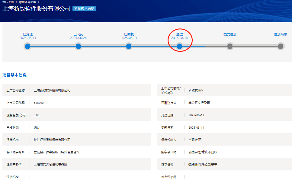 中国经济网北京8月15日讯上交所网站信息显示,新致软件(688590.SH)非公开发行股票于昨日获通过。