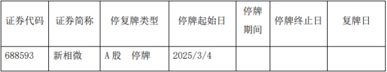 因本次交易尚存在不确定性,为了保证公平信息披露、维护投资者利益,避免对公司股价造成重大影响,根据上海证券交易所的相关规定,经公司申请,公司股票(证券简称:新相微,证券代码:688593)已于2025年3月3日开市起停牌,并将于2025年3月4日开市起继续停牌,预计停牌(累计)时间不超过5个交易日。