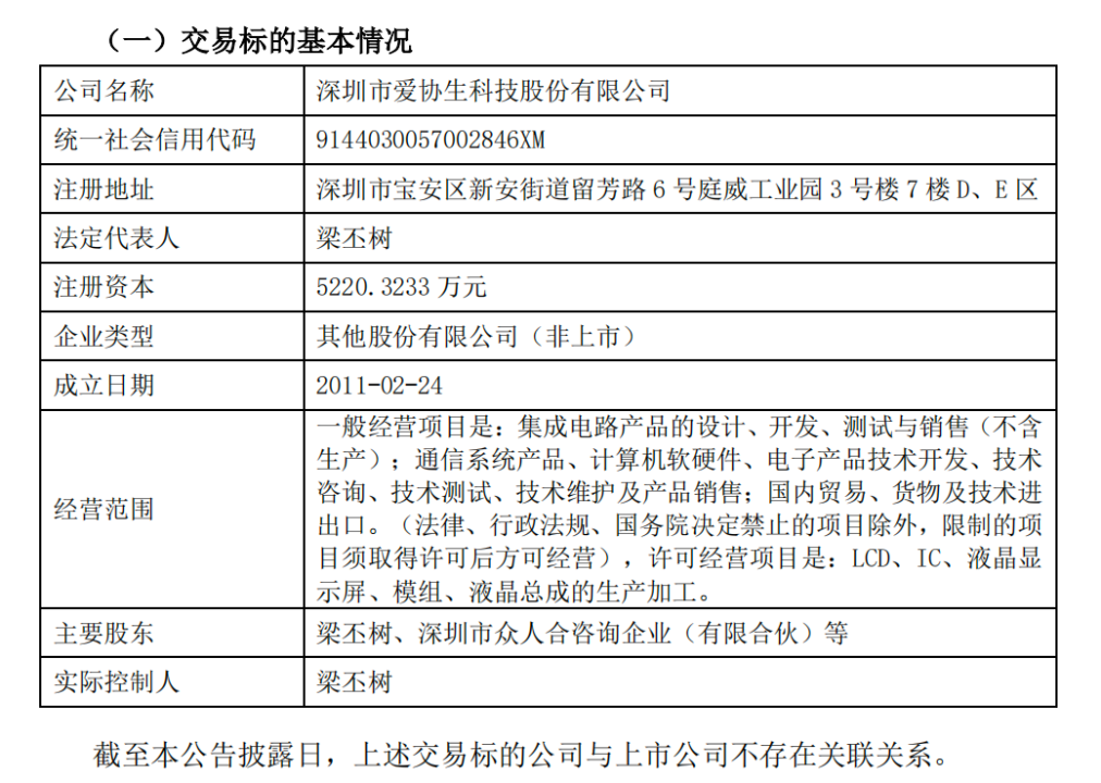 公告显示,爱协生成立于2011年2月,注册资本5220万元,法定代表人为梁丕树。爱协生官网显示,该公司是一家专注于人机交互领域的芯片设计和解决方案提供商。以显触交互、传感、图像处理等核心技术为支撑,围绕各类移动智能终端、智能家居、智能物联等应用场景为客户提供芯片及解决方案。2022年,该公司营业额突破8亿元。