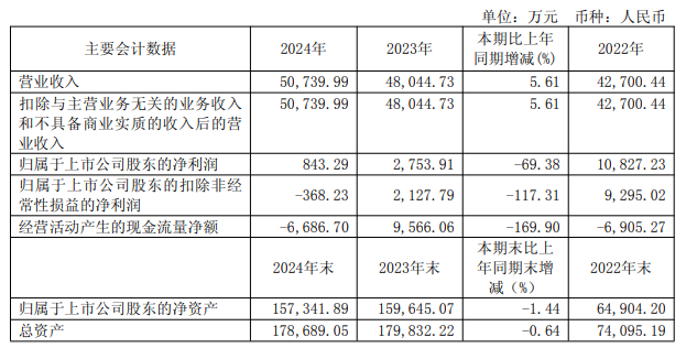 新相微(688593.SH)2024年年度报告显示,新相微报告期内营业总收入为5.07亿元,同比增长5.61%;归属于上市公司股东的净利润为843.29万元,同比下滑69.38%;归属于上市公司股东的扣除非经常性损益的净利润为-368.23万元,去年同期为2127.79万元;经营活动产生的现金流量净额为-6686.70万元。