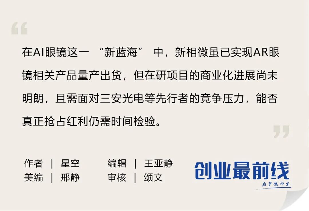 在AI眼镜这一“新蓝海”中,新相微虽已实现AR眼镜相关产品量产出货,但在研项目的商业化进展尚未明朗,且需面对三安光电等先行者的竞争压力,能否真正抢占红利仍需时间检验。