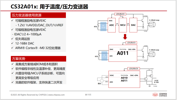 ?温度/压力变送器应用:高集成度设计降低BOM成本与电路板面积,简化系统复杂性。软件编程实现的非线性及温度补偿确保高精度与稳定性。内置诊断功能增强系统安全性与可靠性。灵活的激励电压源、高精度DAC模块与ARM Cortex?-M0处理器共同保障测量准确性与快速响应。