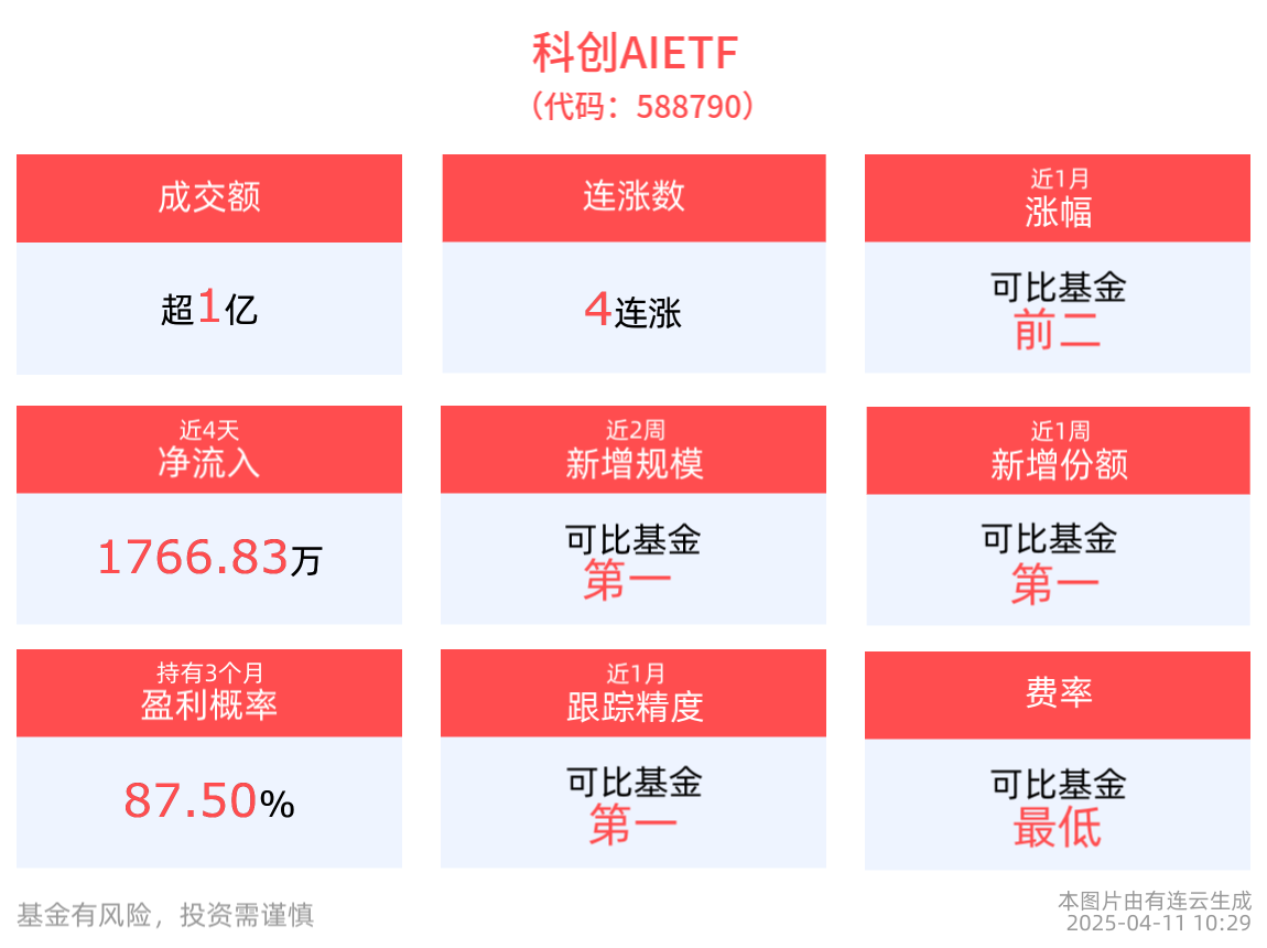 截至2025年4月11日10:29,上证科创板人工智能指数(950180)上涨0.97%,成分股芯海科技(688595)上涨8.19%,澜起科技(688008)上涨5.29%,安路科技(688107)上涨5.01%,恒玄科技(688608)上涨3.70%,天准科技(688003)上涨3.05%。科创AIETF(588790)上涨0.91%,冲击4连涨。最新价报0.55元。拉长时间看,截至2025年4月10日,科创AIETF近3月累计上涨7.70%,涨幅排名可比基金2/6。