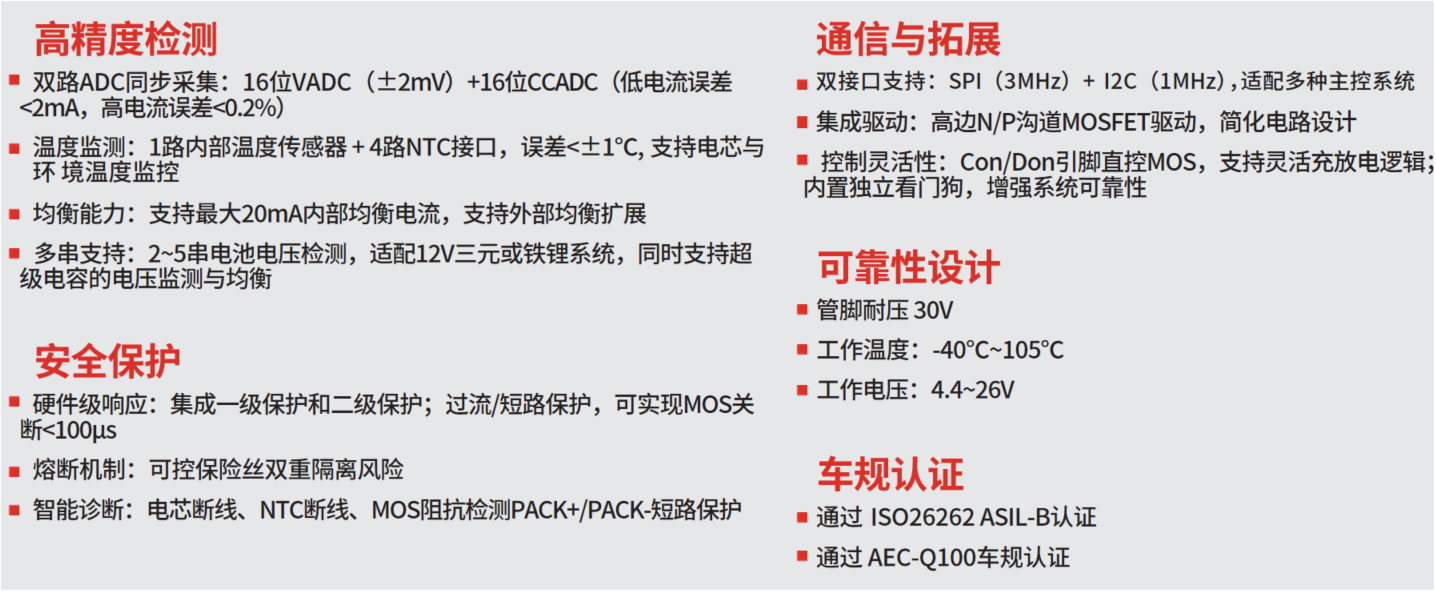 根据ISO 26262标准,车锁ECU备用电源作为车辆安全冗余的关键组成,承担着主电源宕机(如碰撞、故障断电)时门锁解锁、应急警示的核心供电任务,对BMS芯片的安全性、响应速度、低功耗及稳定性提出严苛要求。