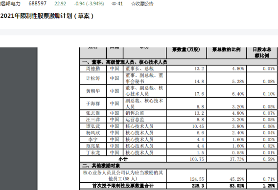 根据煜邦电力披露的2021年限制性股票激励计划(草案),激励计划拟向激励对象授予的限制性股票数量为275万股,约占激励计划公告时公司股本总额17647.298万股的1.56%。