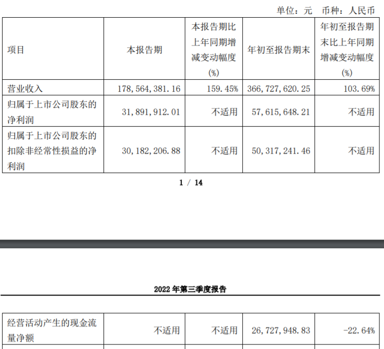 今年第三季度,煜邦电力营业收入为178,564,381.16元,同比增长159.45%;归属于上市公司股东的净利润为31,891,912.01元;归属于上市公司股东的扣非净利润为30,182,206.88元。
