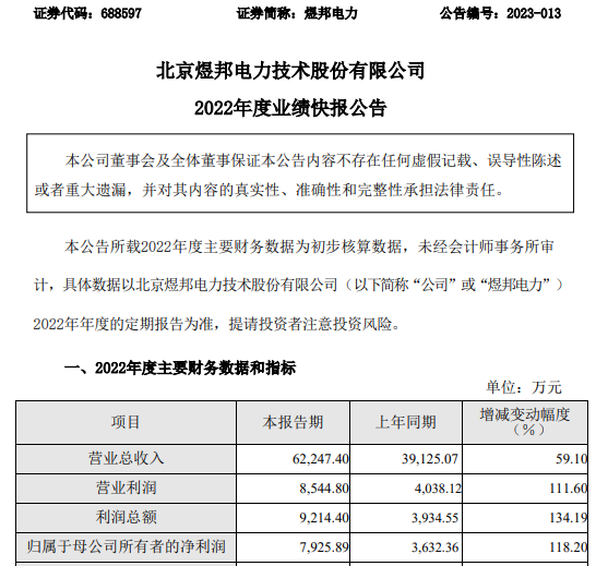 挖贝网2月28日,煜邦电力(688597)发布2022年度业绩快报,公告显示,2022年度营业总收入为62,247.40万元,比上年同期增长59.10%;归属于母公司股东的净利润为7,925.89万元,比上年同期增长118.20%。