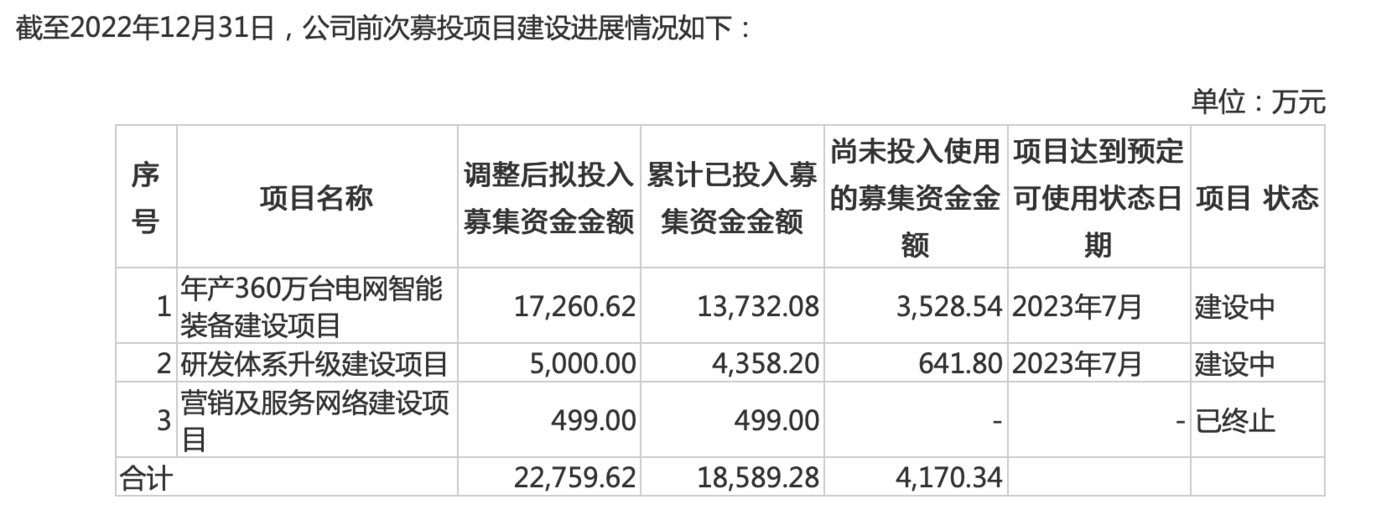 募资缩水后,“年产360万台电网智能装备建设项目”的投入也由2.39亿元减半至1.28亿元。于是公司半途终止了“营销及服务网络建设项目”,并将该项目的剩余募集资金用于建设“年产360万台电网智能装备建设项目”,调整后该项目的投入为1.73亿元。