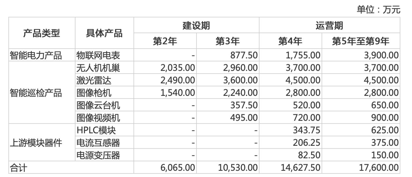 本次公司拟发行可转债拟募资4.11亿元,主要用于建设物联网电表、无人机机巢、激光雷达、输电线路图像在线监测装置等产品生产线。预计项目今年7月开始实施,建设期为30个月。根据公司测算,项目实施后第二年部分产线便可投产,建设期结束后新产线第4年可实现收入1.46亿元,第5至9年可实现收入1.76亿元。