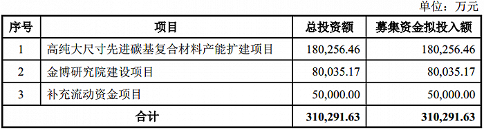 金博股份此次定增募资主要用于高纯大尺寸先进碳基复合材料产能扩建项目(拟投入募资18.03亿元)、金博研究院建设项目(拟投入募资8亿元)以及补充流动资金项目(5亿元)。
