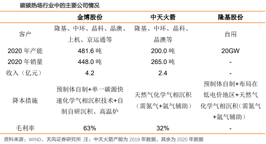 金博股份是碳碳热场行业绝对龙头,2018年公司坩埚市占率达33%,2020年热场销量达448吨。天风证券测算,公司2020年全球市占率约27%。