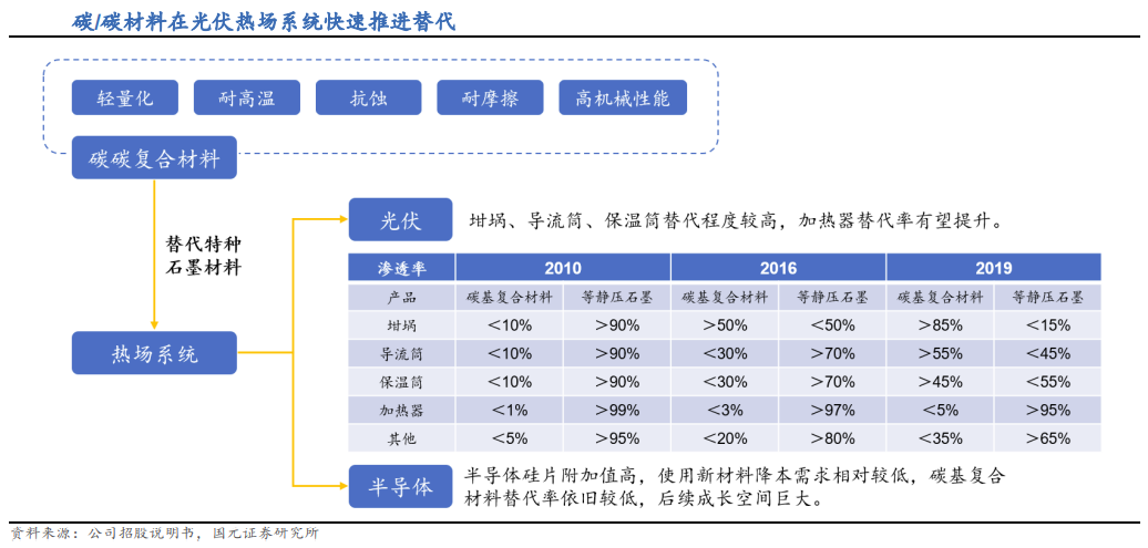 碳基复合材料应用领域广阔,除光伏热场外,还可应用于半导体热场、刹车制动、动密封、耐腐蚀等领域应用。