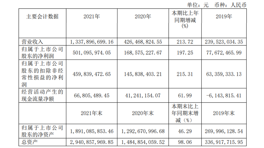 据其2022年2月发布的年报显示,2021 年年度实现营业收入 13.38 亿元,归属于上市公司股东的净利润 5.01 亿元,同比分别增长 213.72%和 197.25%,归属于上市公司股东的扣除非经常性损益的净利润 4.6 亿元,同比增长 215.31%。