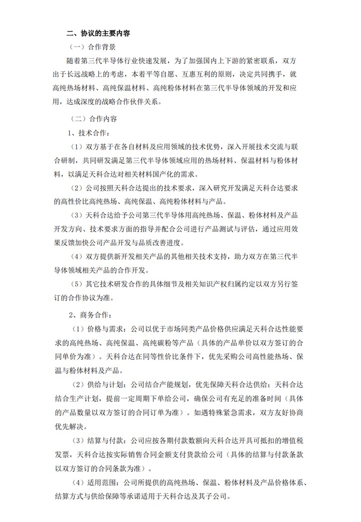 4月9日,湖南金博碳素股份有限公司(下称“金博股份”)发布公告,基于在半导体领域用高纯碳基复合材料的研发应用基础,与北京天科合达半导体股份有限公司签署《战略合作协议》。双方就高纯热场材料、高纯保温材料、高纯粉体材料在第三代半导体领域的开发和应用,达成深度的战略合作伙伴关系。