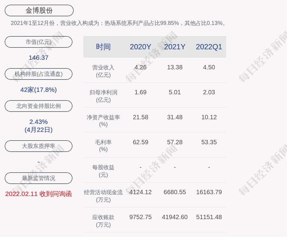 2021年1至12月份,金博股份的营业收入构成为:热场系统系列产品占比99.85%,其他占比0.13%。
