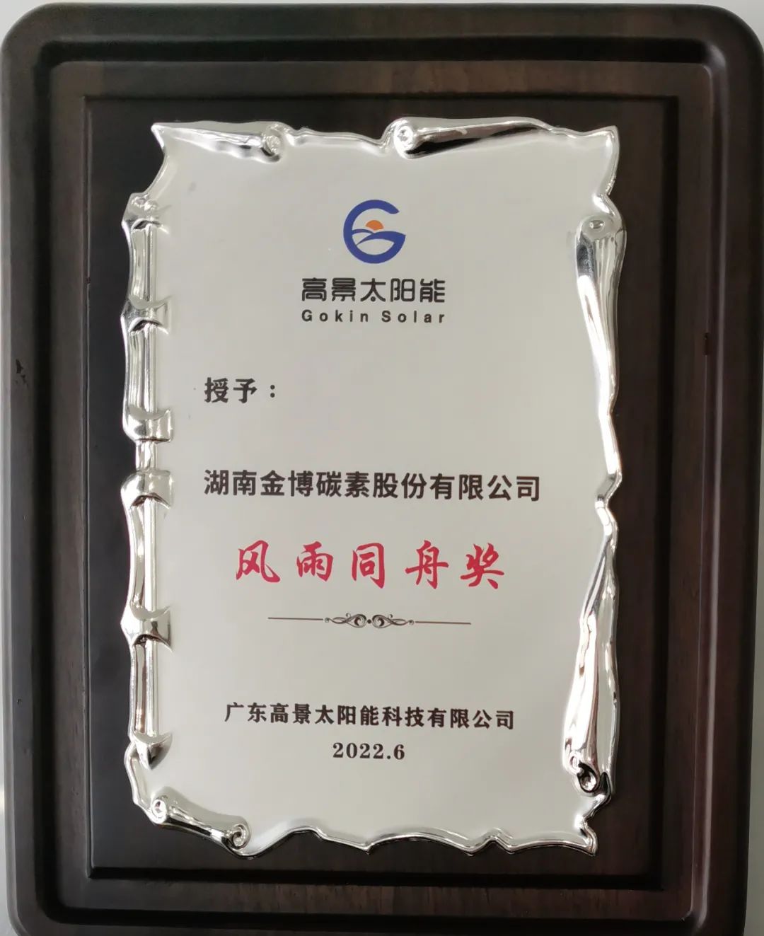2022年6月10日,金博股份受邀参加由广东高景太阳能科技有限公司(以下简称“高景太阳能”)主办的“风雨同舟、携手新征程” 30GW满产答谢活动,并荣获高景太阳能颁发的“风雨同舟奖”。