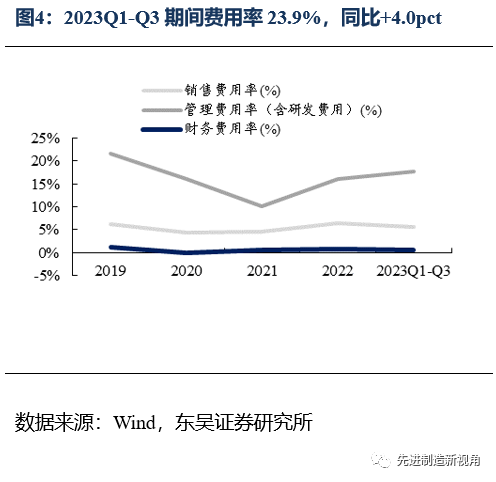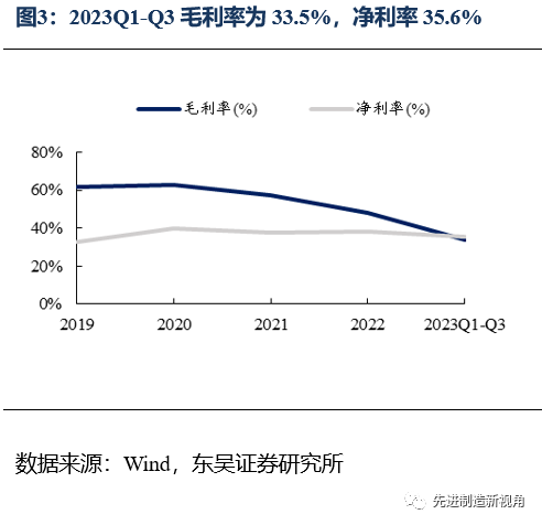 2023年前三季度公司毛利率为33.5%,同比-16.6pct;净利率35.6%,同比-7.7pct;期间费用率为23.9%,同比+4.0pct,其中销售费用率为5.6%,同比+0.8pct,管理费用率(含研发)为17.7%,同比+3.6pct,财务费用率为0.6%,同比-0.5pct;Q3单季毛利率为26.8%,同比-16.9pct,环比-10.3pct,净利率为10.7%,同比-32.1pct,环比-43.5pct。