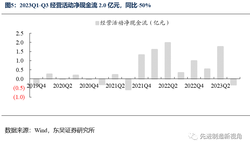 截至2023Q3末公司存货为2.0亿元,同比+13%,合同负债为0.1亿元,同比-2%,2023Q1-Q3的经营性净现金流为2.0亿元,同比-50%。