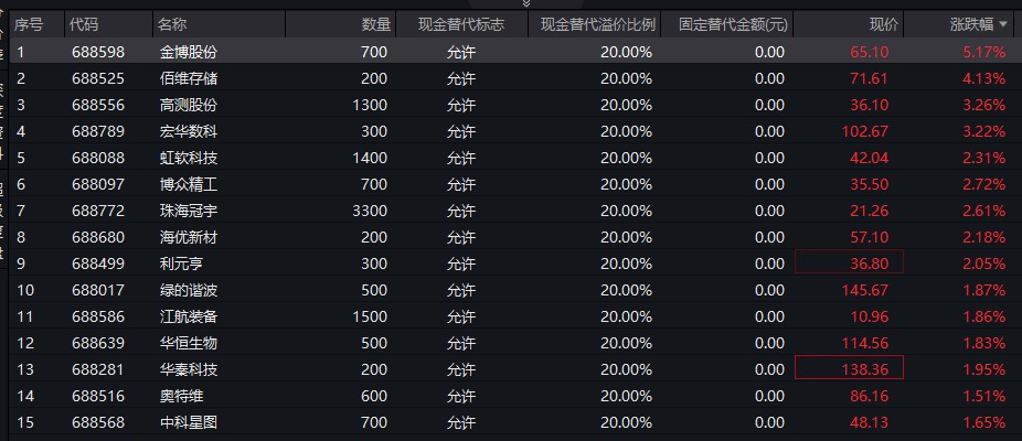 科创100ETF基金紧密跟踪上证科创板100指数,截至2023年12月22日11:16,指数成份股中涨多跌少,金博股份上涨5.17%,佰维科技、高测股份等个股跟涨。