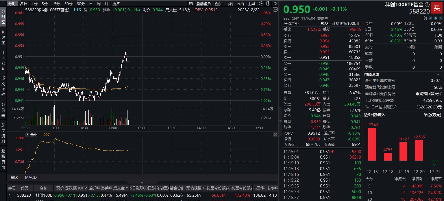 截至2023年12月22日11:16,科创100ETF基金(588220)下跌0.11%,成交额5.49亿元,委比12.25%,换手率8.47%,市场交投活跃。数据显示,该基金近20日有18日均获资金净流入,合计“吸金”达20.74亿元,净流率42.10%。