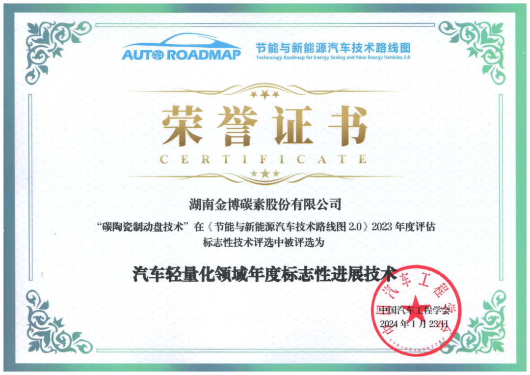 近日,在中国汽车工程学会举办的《节能与新能源汽车技术路线图2.0》2023年度标志性技术评选中,金博股份“碳陶瓷制动盘技术”获评“汽车轻量化领域年度标志性进展技术”。
