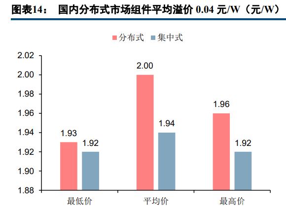分布式市场相比于集中式市场,电站项目 BOS 成本明显更低,以及部分分布式项目采用“自发自用,余电上网”的模式,能够进一步提高项目全投资 IRR。因此,同样一款组件产品,销往分布式市场能够比集中式市场卖出一定溢价。