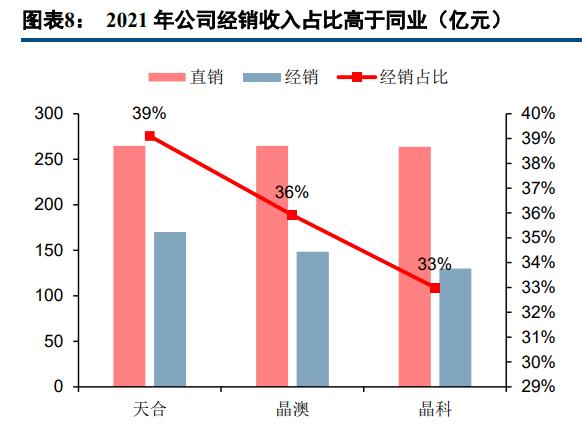公司分销收入占比高于其他头部组件企业。公司对自身定位为全球领先的整体能源解决方案提供商,对下游客户提供组件产品的同时也提供相应服务,尤其是在分布式市场,公司具备较强竞争力。从销售模式来看,户用、工商业分布式客户往往以经销业务模式为主,具备一定 to C 属性,毛利率高于直销模式,且品牌、渠道壁垒更高。2021 年,公司分销业务收入占比达到 39%,高于晶澳、晶科等其他头部组件企业。