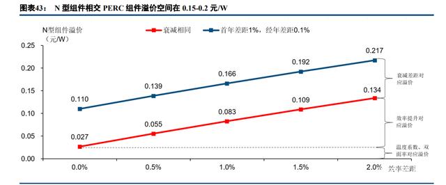而溢价来源主要包括三个:1)N 型电池片效率由 23%提至 24.5%,能带来 BOS 成本下降的 0.082 元/W 溢价空间;2)低温度系数以及高双面率大约能够带来 0.027 元/W 的溢价空间;3)N 型组件低衰减速率能够带来大约 0.083 元/W 的溢价空间。