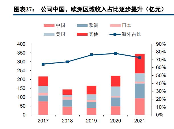 区域结构上,公司组件销售全球多点开花,欧洲占比连续两年提升。公司过去以美国为海外主要收入板块,但近年来受美国政策多变影响,美国比例波动较大。近两年来,公司欧洲收入占比连续提升,2021 年达到公司海外收入 33%的占比,预计 2022 年还将进一步提升。