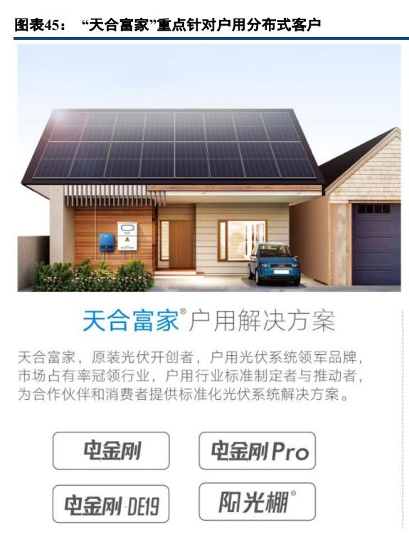 公司目前针对户用、工商业分布式客户分别推出“天合富家”、“天合蓝天”系统,从而满足分布式市场客户的差异化需求。其中“天合富家”主要产品包括“电金刚”、“电金刚 PRO”、“电金刚 DE19”,所用组件采用 210 大尺寸硅片、三分片、无损切割技术以及 MBB 技术,降低电流损耗,提高产品可靠性。“天合蓝天”主要包括“SPVC 天合智慧光伏能源车库”和“天能瓦 BIPV”产品。