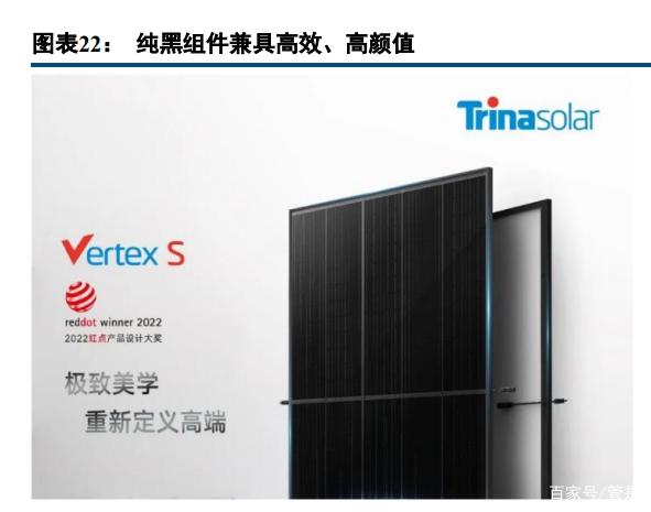 为分布式赋予高颜值,纯黑组件获红点设计大奖。2022 年度德国红点设计大奖(Red Dot Design Award)颁布,其是全球专业度最高、最具权威性的顶级设计大奖。天合光能 Vertex S 系列产品凭借着先进的设计理念和卓越的产品体验,从 60 余个国家、近万件参选产品中脱颖而出,成功斩获 Red Dot 红点奖。而天合光能也是国内首获此殊荣的一线组件厂商。
