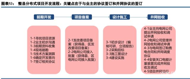 国家能源局发文推动整县分布式光伏项目,地方积极推动,分布式市场资源快速释放,预计“十四五”期间年均规模 50GW 以上。2021 年 6 月 20 日,国家能源局正式下发《关于报送整县(市、区)屋顶分布式光伏开始试点方案的通知》,要求申报屋顶分布式光伏开发试点县,屋顶可安装光伏发电比例中,党政机关建筑不低于 50%、公共建筑屋顶不低于 40%、工商业厂房屋顶不低于 30%、农村居民屋顶不低于 20%,并要求“宜建尽建”、“应接尽接”。整县推进方案只需通过省内审批即可实施,各省自主性强,政府与电网不会大包大揽,将试点的分布式光伏建设交由市场主导。分布式单体项目快速整合、集约开发,开发效率快速提高。整县推进将分布式 KW 级小项目打包开发,预计单县项目规模 200MW 左右,项目快速整合、集约开发,开发效率快速提升。