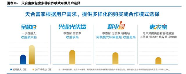 业务模式较多,客户可选择空间大。公司“天合富家”产品目前的业务模式包括四种:全款购(全款模式)+光伏贷&合约购(贷款模式)+租电赞(租电站)+惠农宝(合作共建)。全款模式初期需要大量的初始资金投入,但净收益最高。贷款模式前期投资较低,电费收益用于支付银行贷款本息以及电站运营维护费用,剩余部分作为用户收益。租电赞模式中用户以租赁设备的方式在屋顶建设光伏电站,18 年租赁期内用户获得固定收益,租赁期满后收益全部归用户所有。惠农宝模式中农户无需支付首付和保证金,用户提供自有屋顶,天合富家提供原装光伏系统,用户每年可获取固定收益。